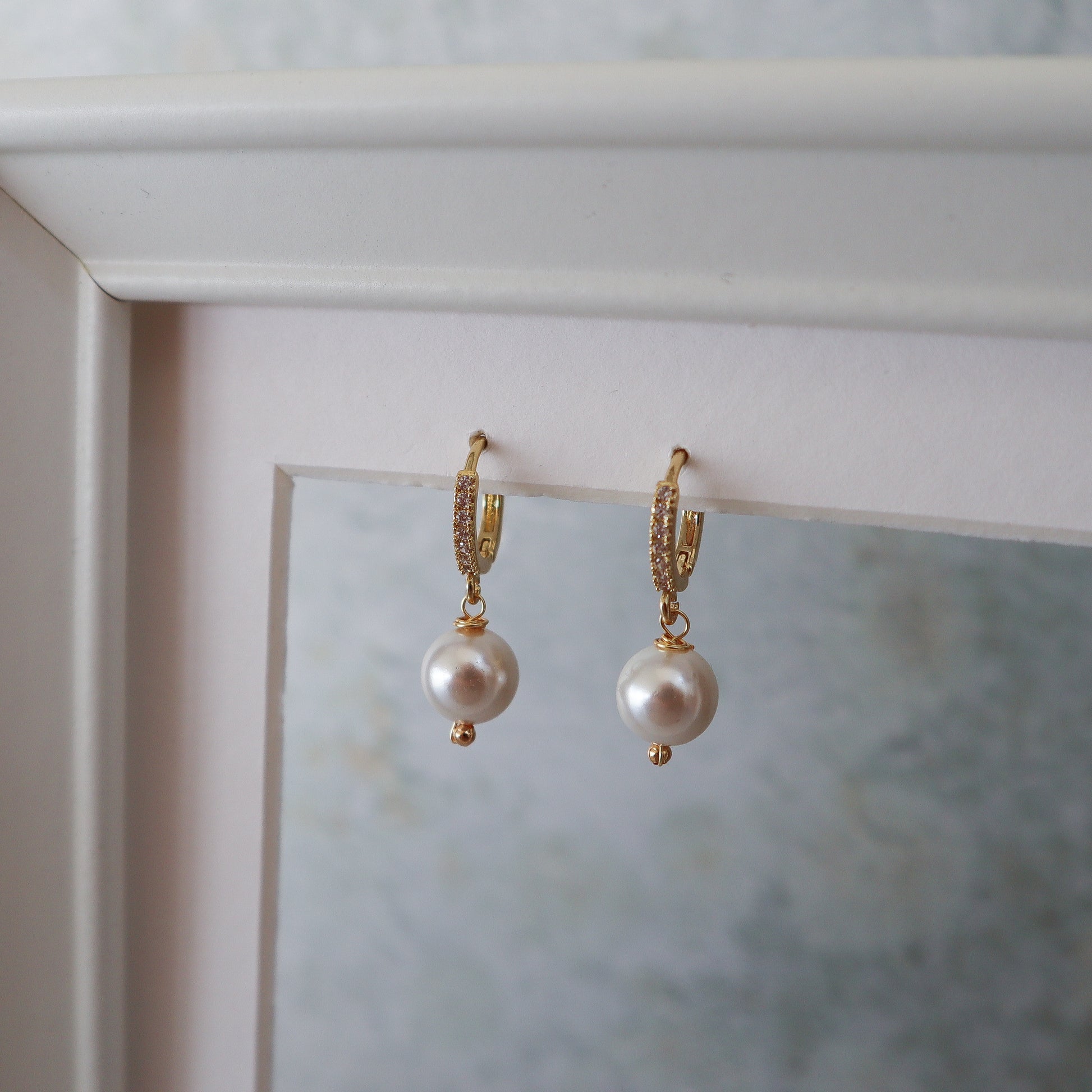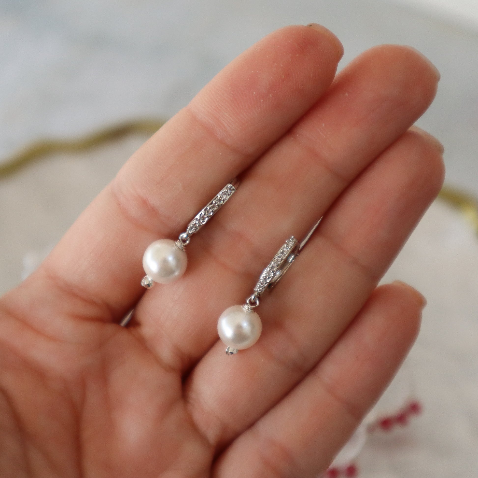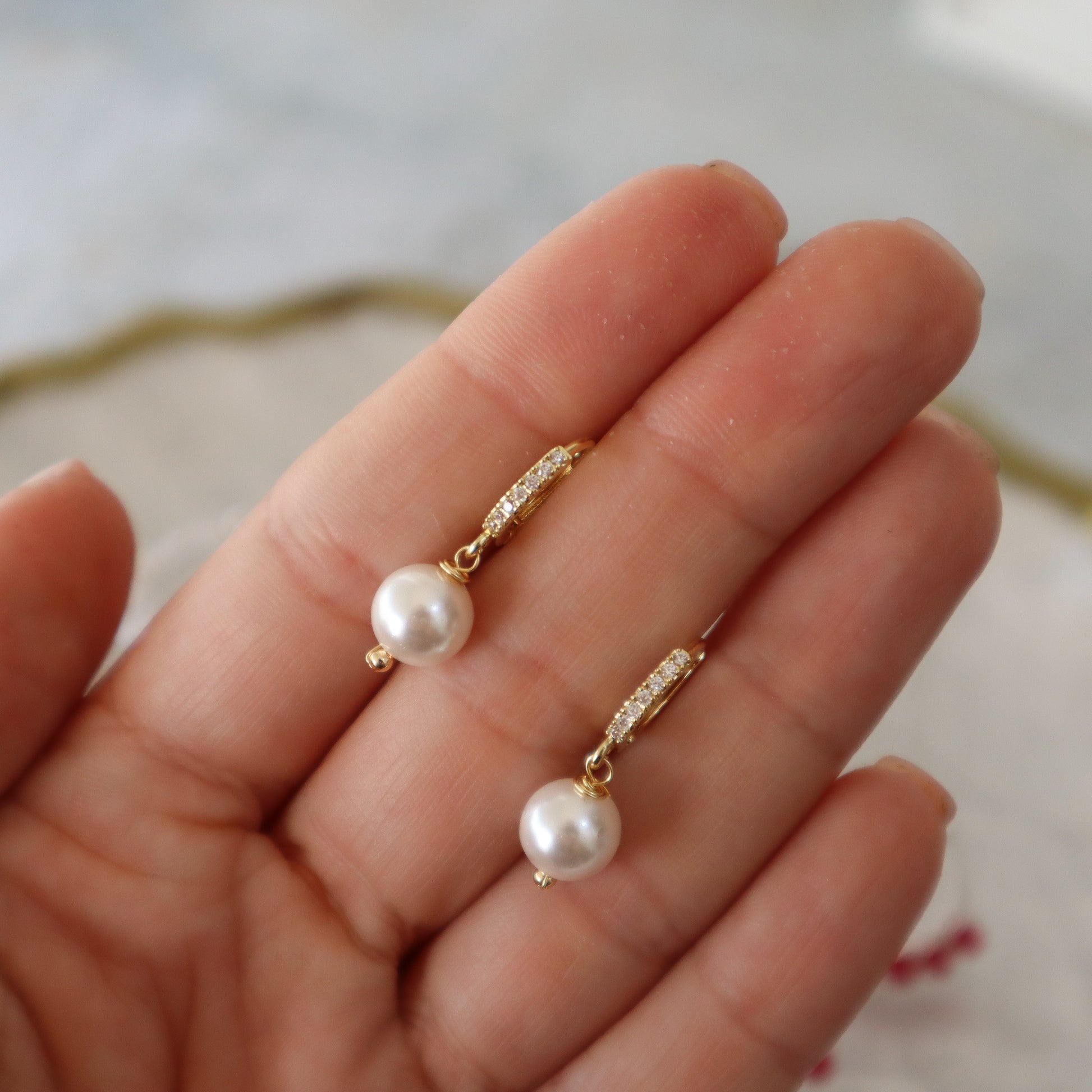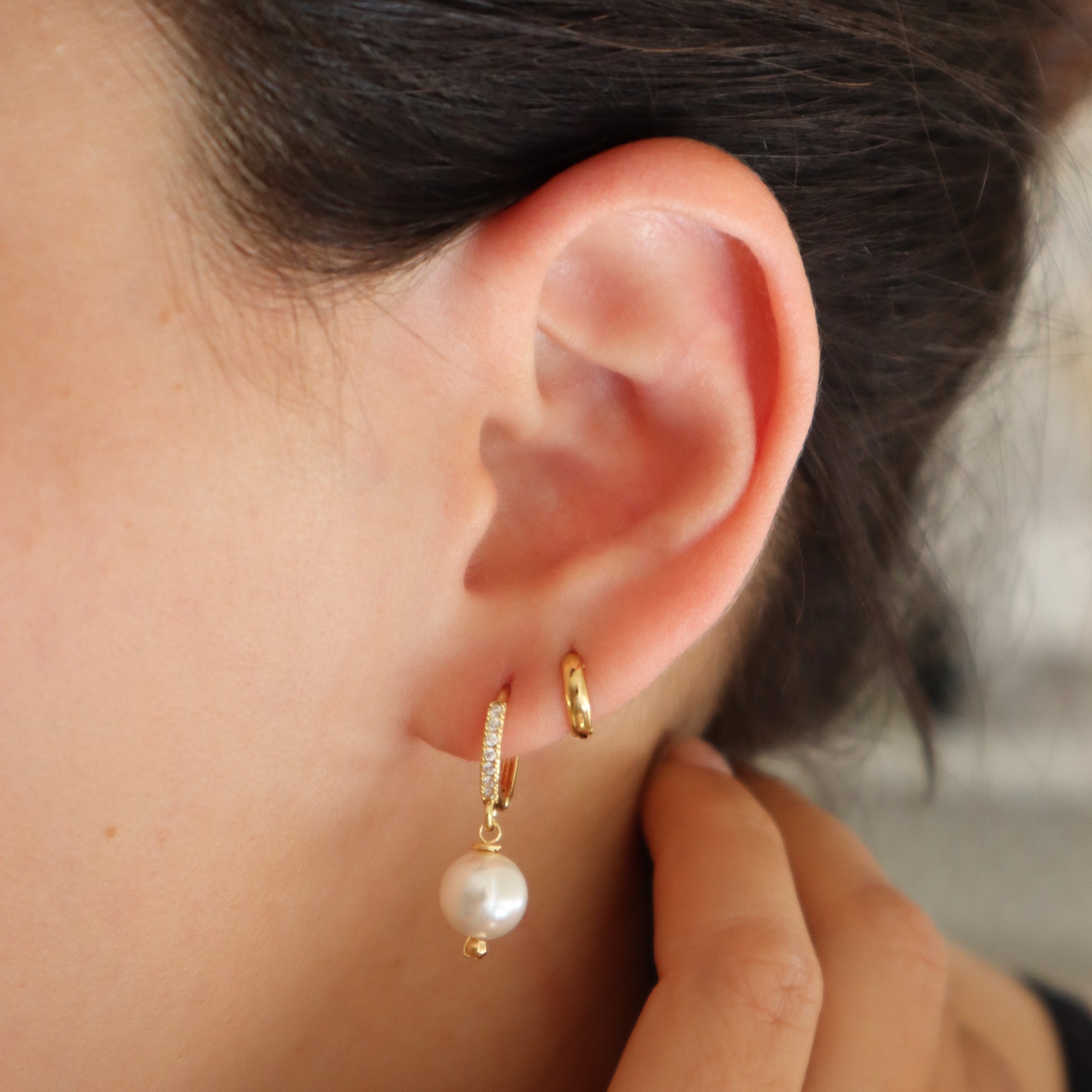 Clásica y elegante argollas con inscrustacion en microcircones y perla shell colgante.