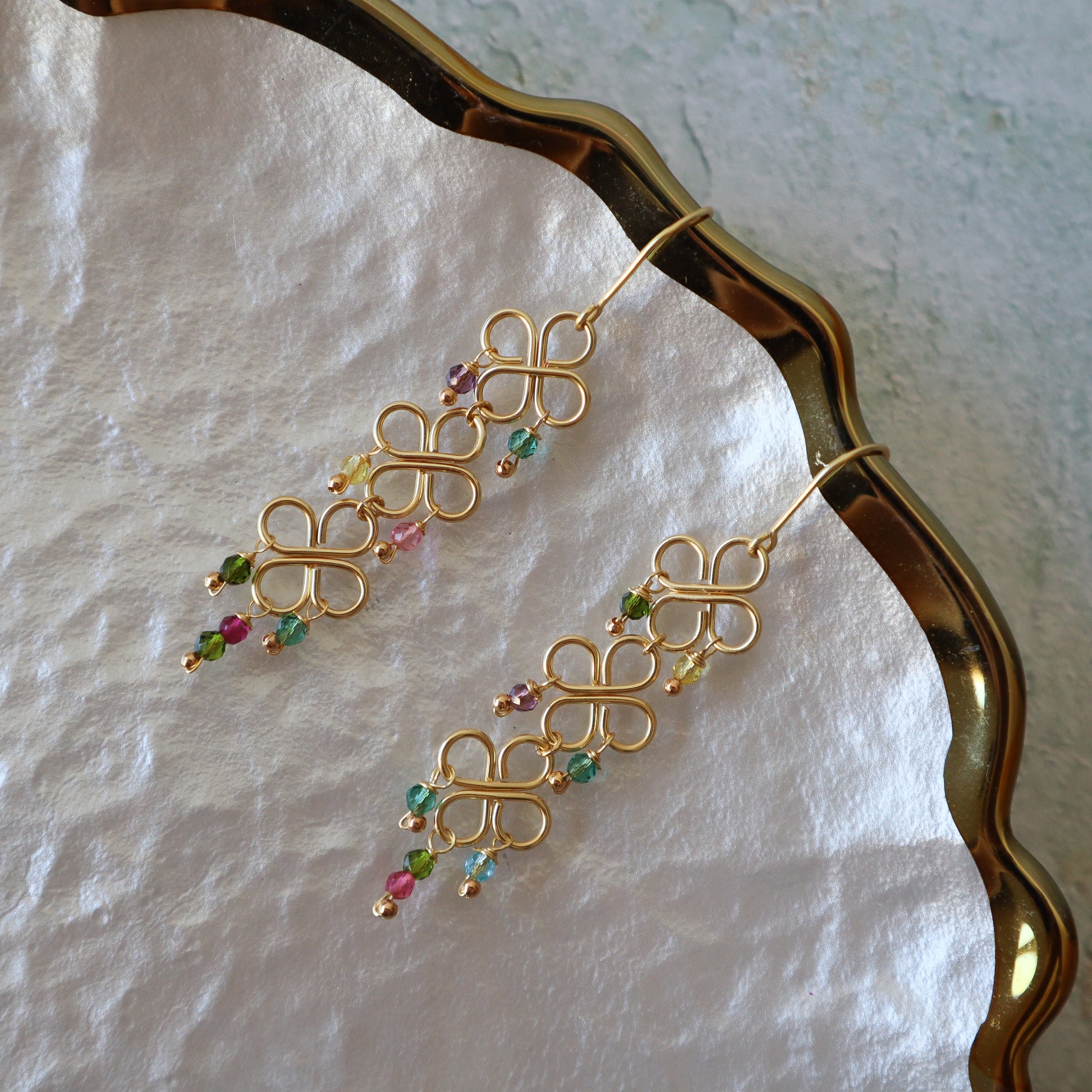 Elaborados a mano con piezas en bali de oro brasileño y apliques en cristales.